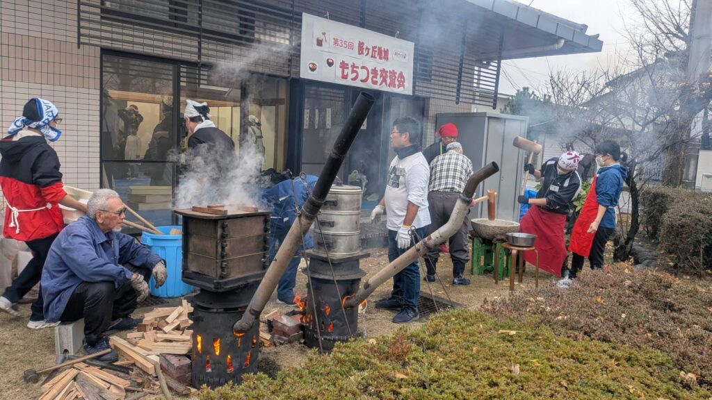 力強い火力で蒸し上げられたもち米が、手際よくつきあげられていく様子は迫力があり、訪れた人たちの視線を集めていました。こうした伝統行事が35回も続いていること自体が、桜が丘地域のつながりの深さを物語っているように感じられました。