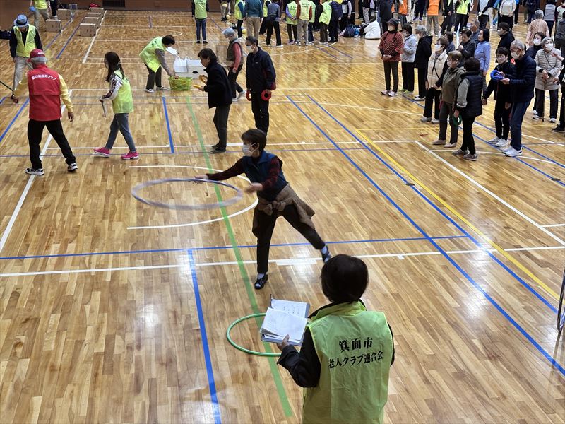 当日は、市老連会長の挨拶に続き、原田市長から激励のお言葉をいただき、準備体操を終えて、いよいよ競技がスタートしました。輪投げ、ピンボウリング、フリスビー、グラウンド・ゴルフなど、計10種目の競技に挑戦しました。