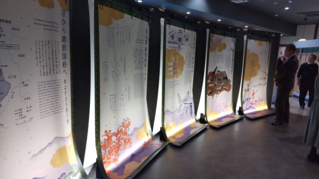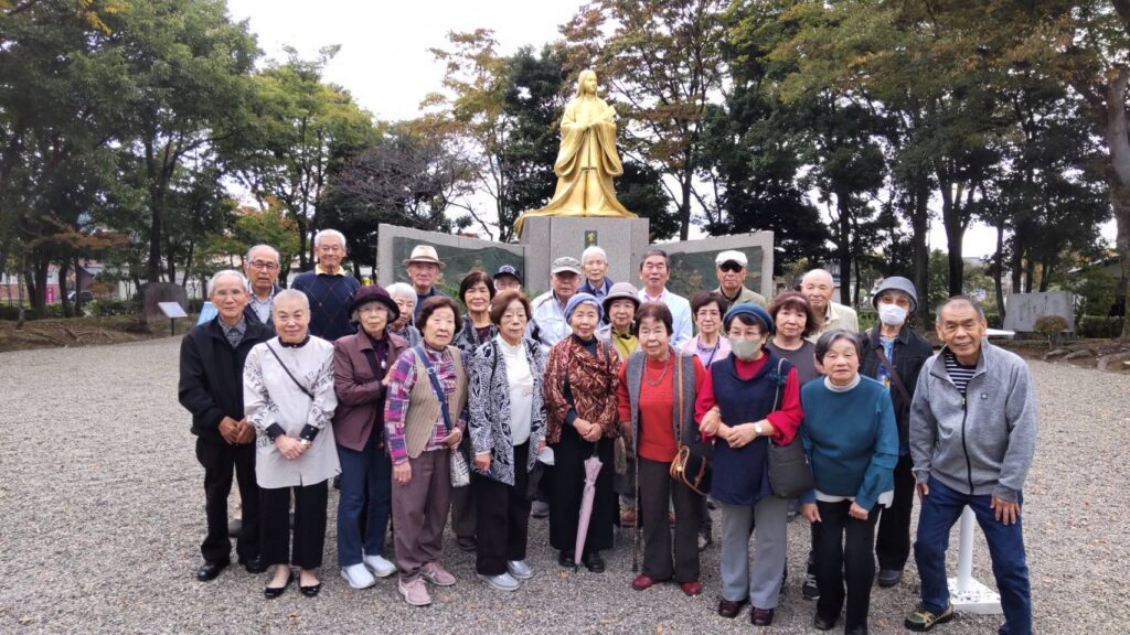 2日目は羽二重餅のふる里を訪ねた後、源氏物語で有名な紫式部ゆかりの地にある公園へ行き、金ピカの巨大な像に出迎えてもらいました。紫式部はこの地での暮らしで大陸文化の影響も受け、作風にも生かされていきます。