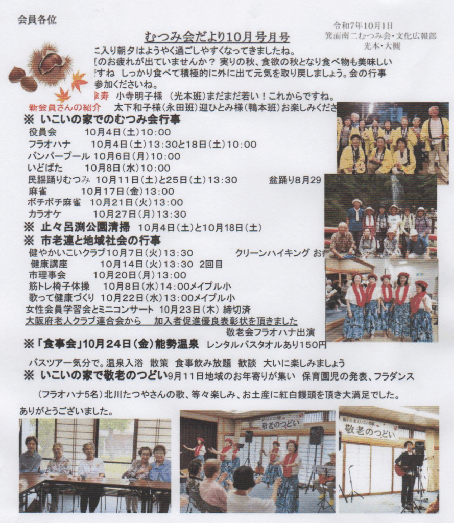 箕面南二むつみ会は、桜ケ丘地域を拠点に「健康・交流・楽しみ」を大切に活動している老人クラブです。地域に根差し、仲間と共に心豊かな時間を過ごすことを目的に、毎月多彩な行事や同好会を開催しています。文化活動や運動、趣味の場を通じて、生きがいを持ち続け、世代を超えた交流の輪を広げています。