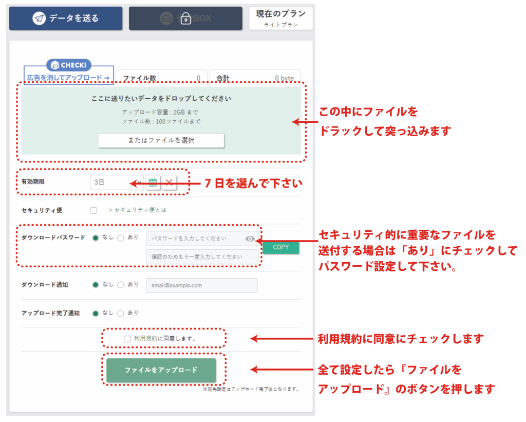 送る容量によって切り替える必要があります。その方法については下記にてご案内します。
